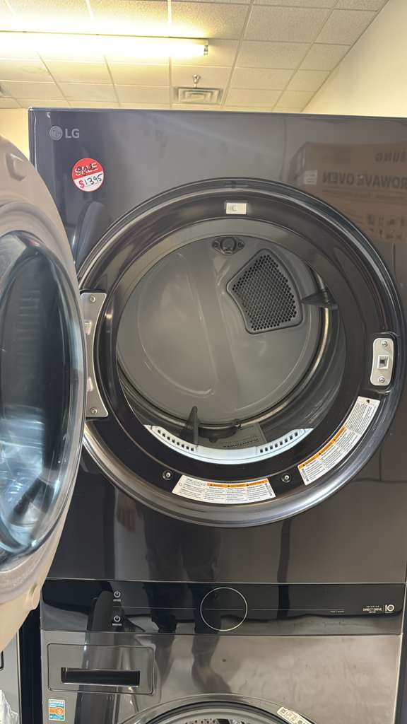 27″ LG WashTower all-in-one laundry center featuring a 4.5 cu. ft. front load washer and 7.4 cu. ft. gas dryer. Includes Center Control™ panel, AI fabric care, TurboWash 360°, TurboSteam, Allergiene cycle, and Wi-Fi smart connectivity. Designed for powerful performance in a space-saving vertical design.