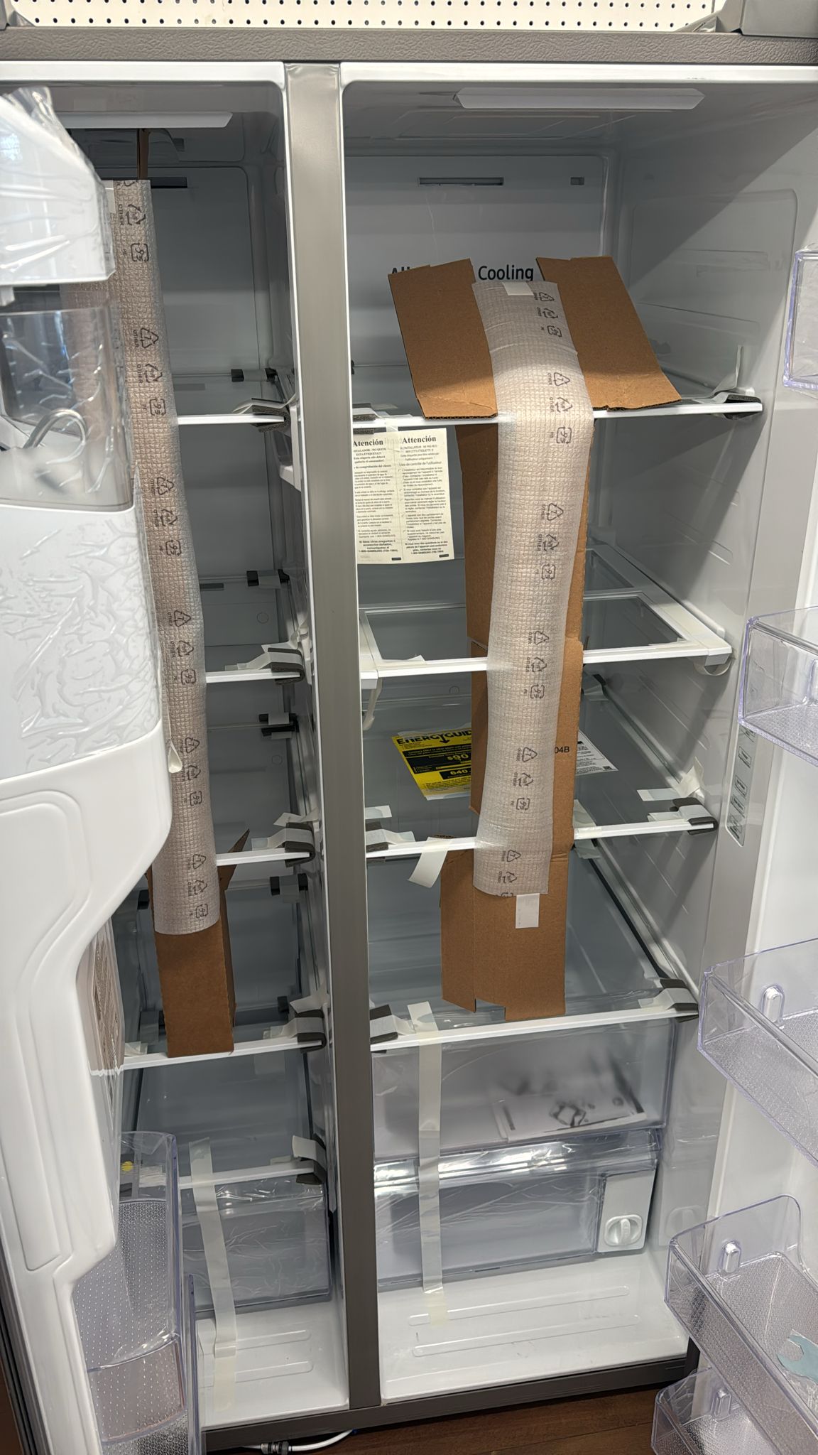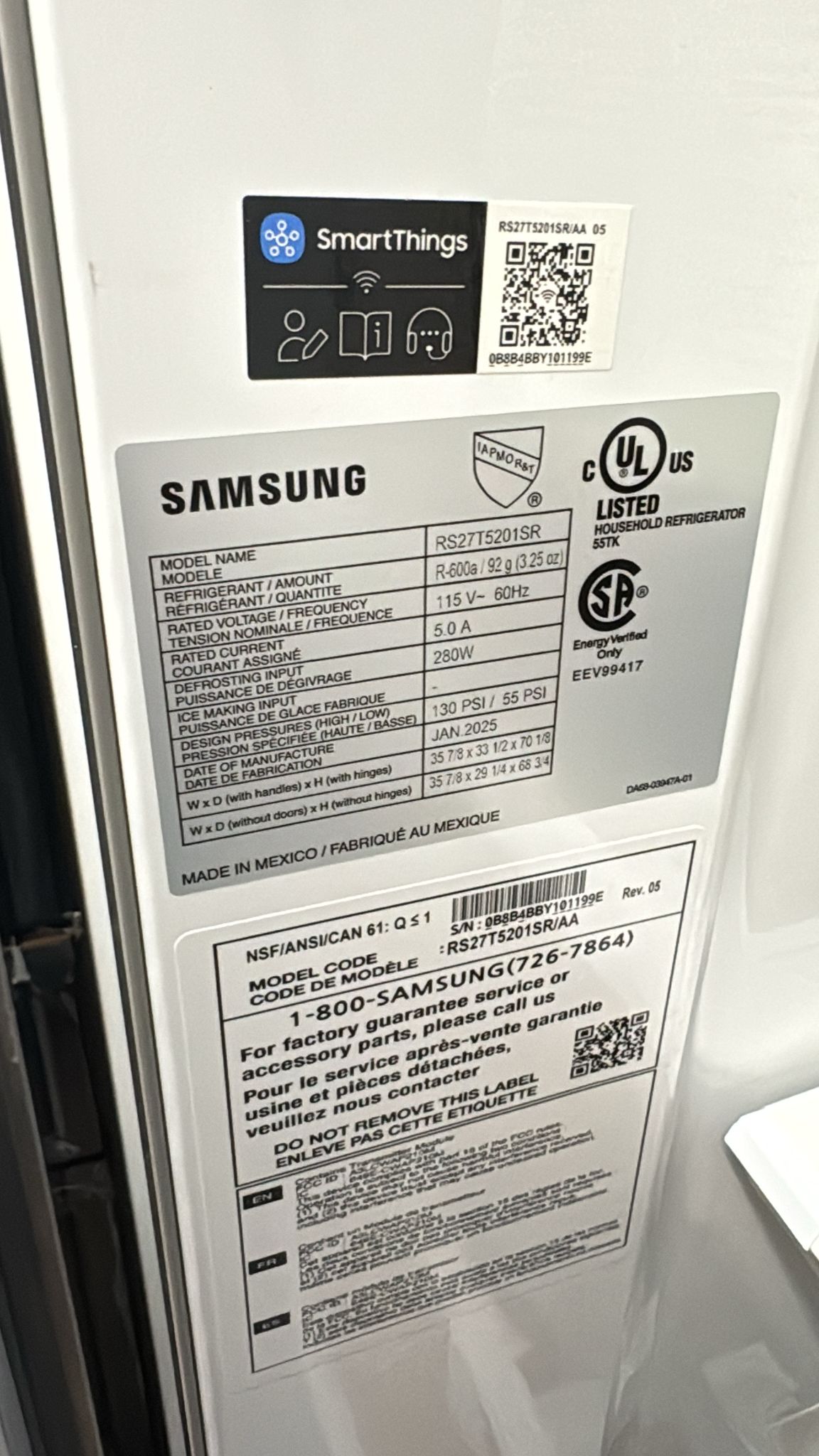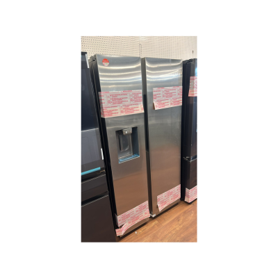 The Samsung is a spacious 27.4 cu.ft side-by-side refrigerator featuring a modern fingerprint-resistant stainless steel finish, built-in water and ice dispenser, and Wi-Fi connectivity for smart temperature control and convenience.